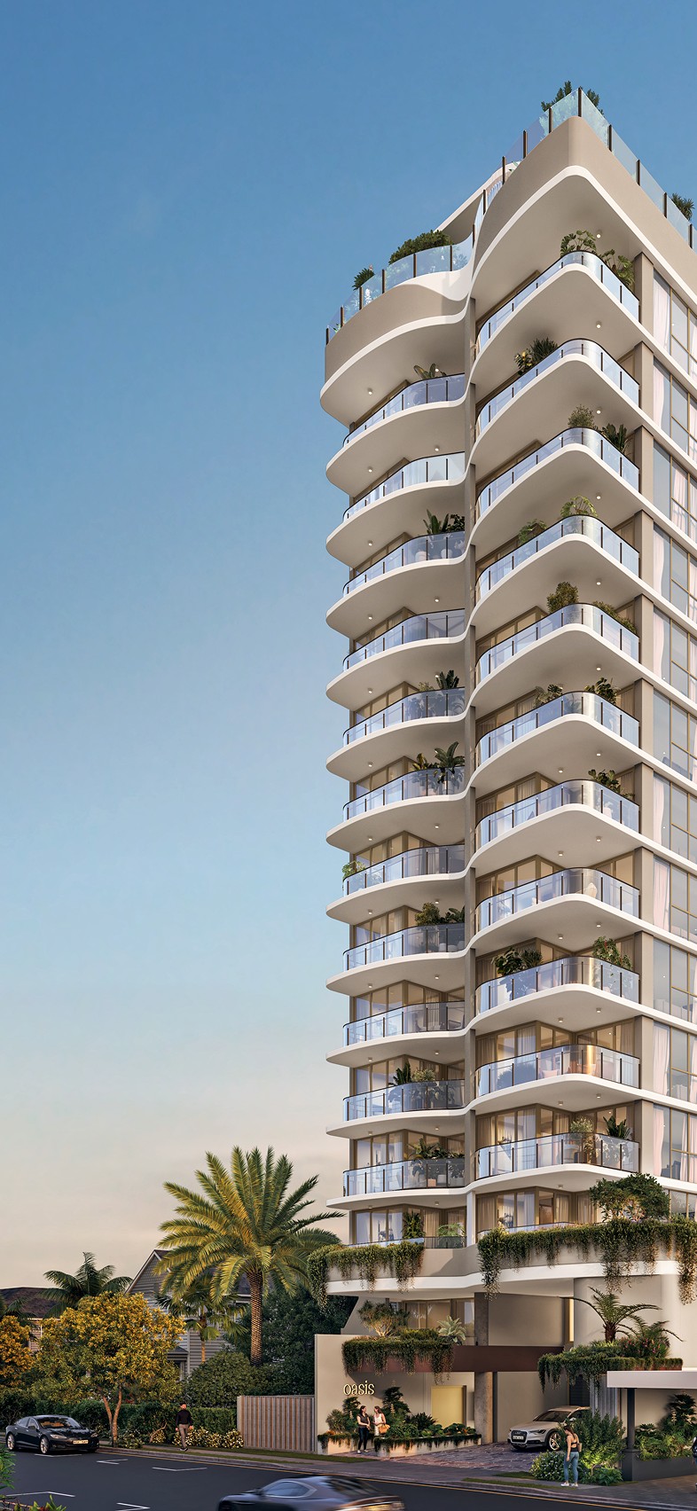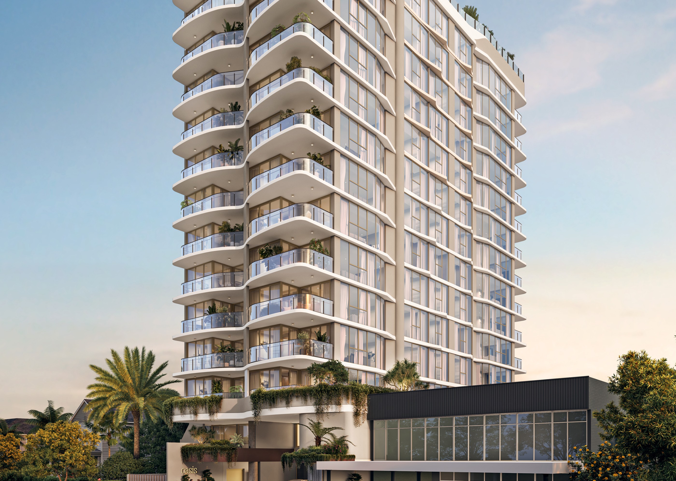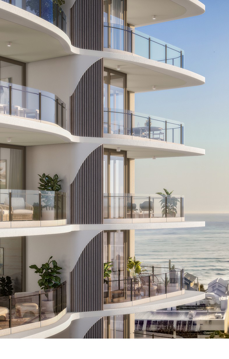 Oasis is a continuation of our exploration of Mediterranean minimalism — a way of bringing the ease of resort living into the rhythm of everyday life. The balconies sweep outward like waves and wings, drawing the building into dialogue with the beachscape, fluid and free. Soft whites and calm neutrals echo the tranquillity of the Mediterranean, while lush greenery softens the form, creating a serene, elevated oasis. It’s a luxurious coastal escape — elegant yet effortlessly relaxed.”